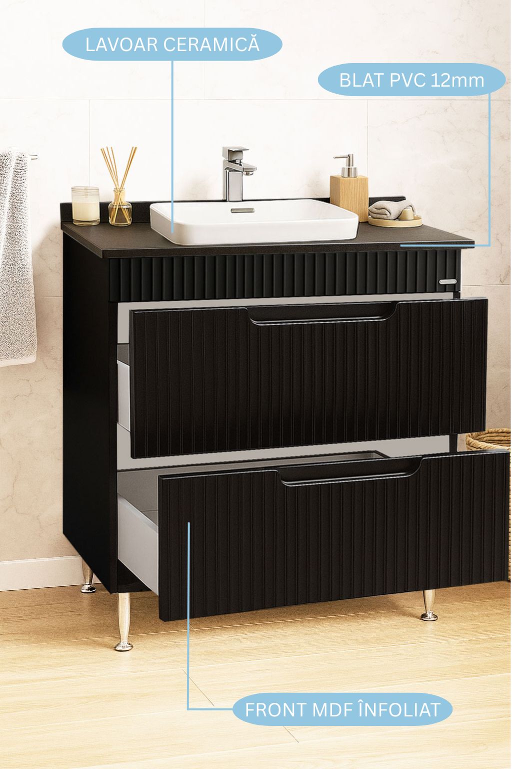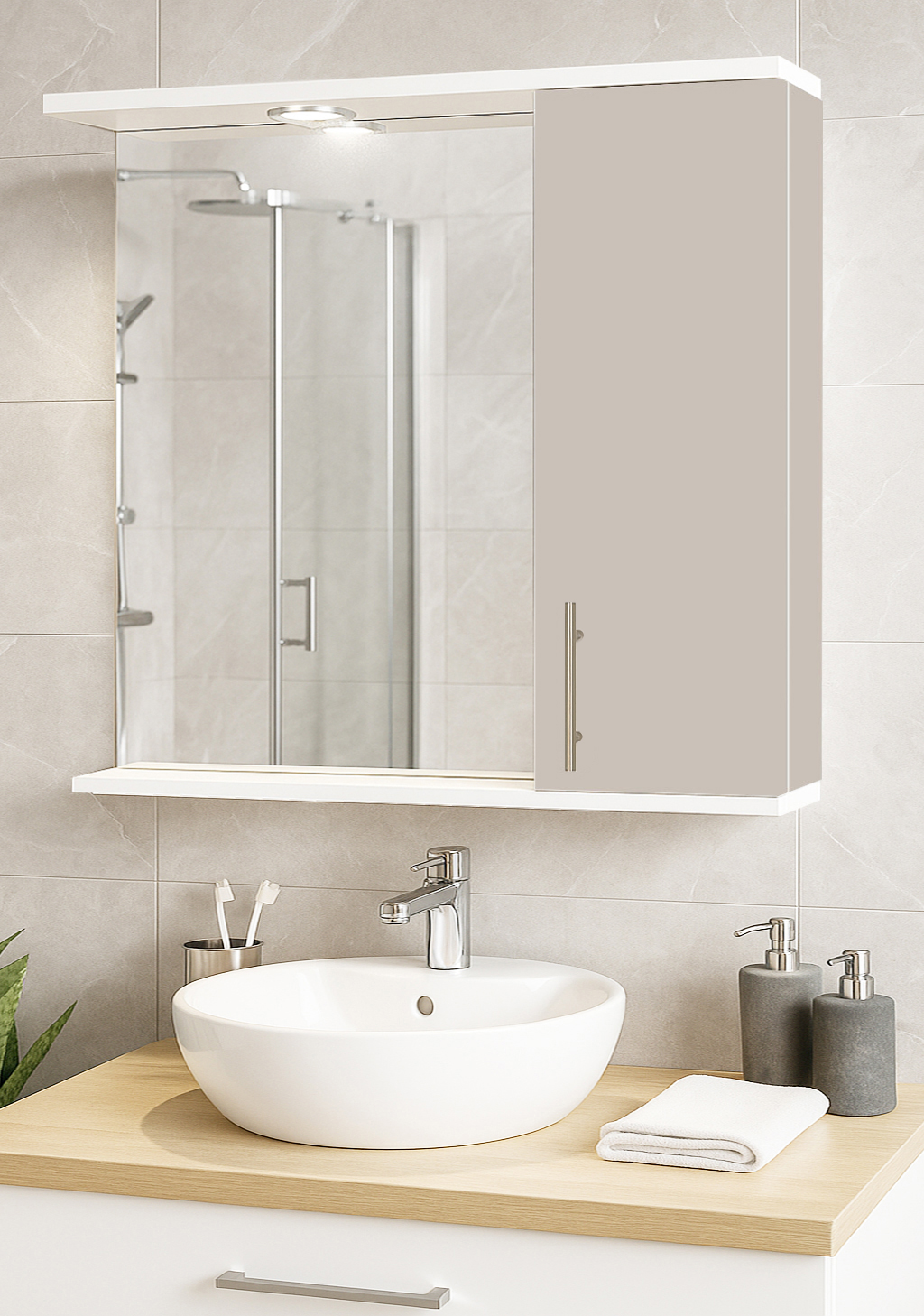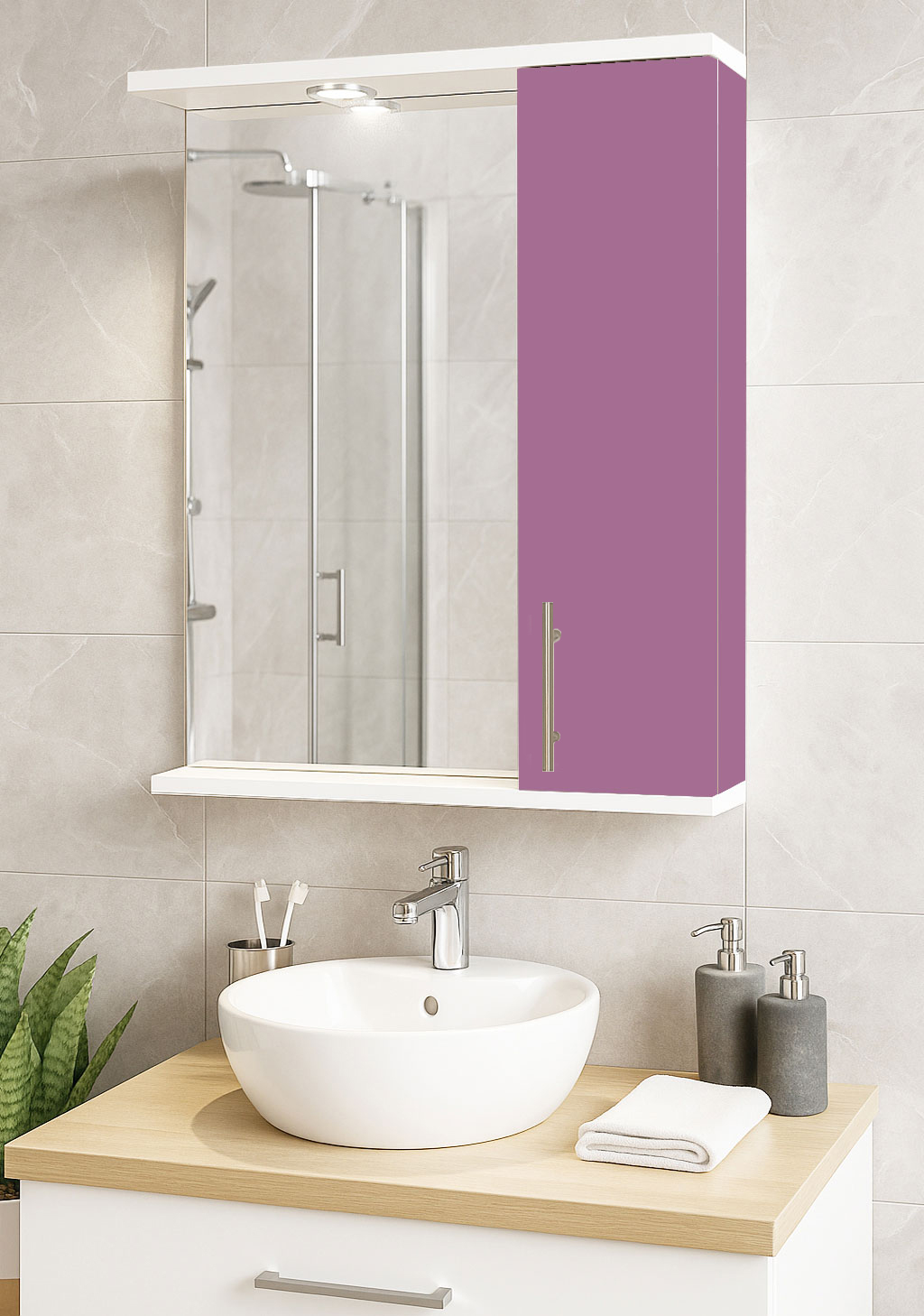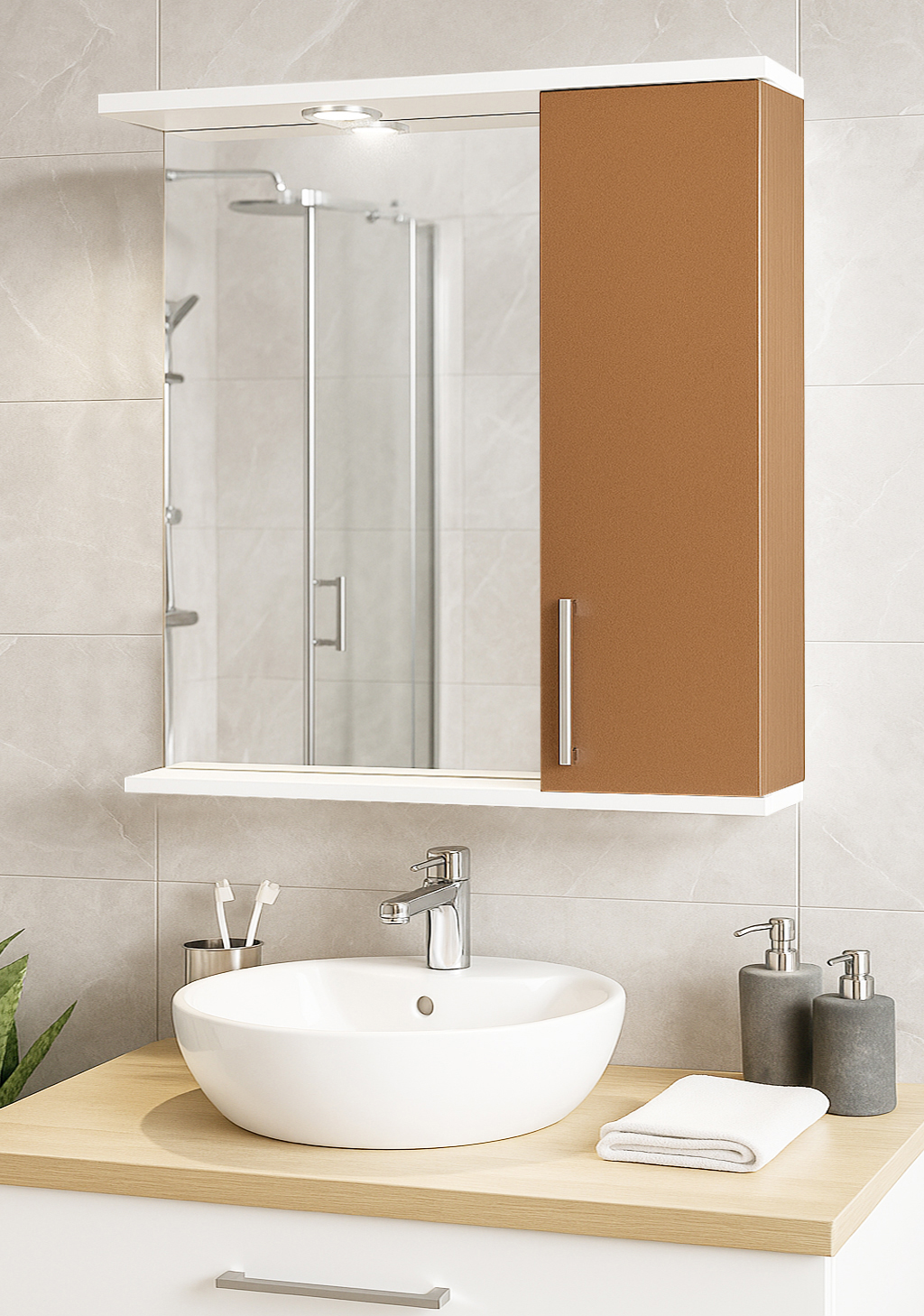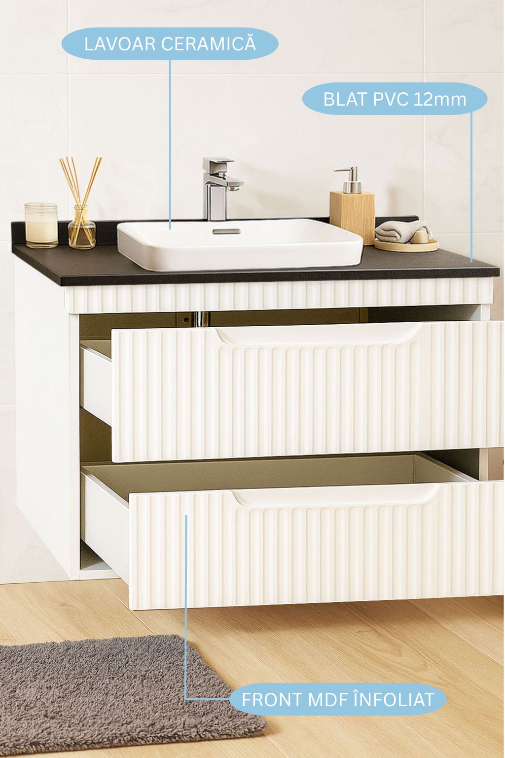 De la mobilier suspendat, la dulapuri spațioase sau oglinzi cu depozitare integrată, vei găsi opțiuni versatile care transformă baia într-un spațiu organizat și elegant.