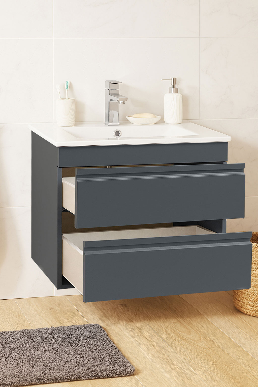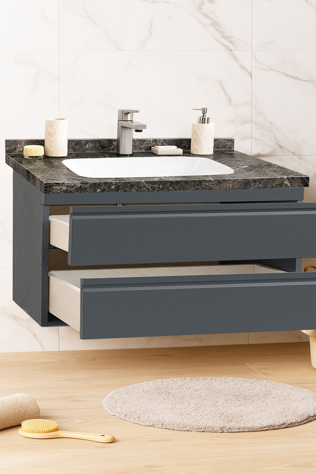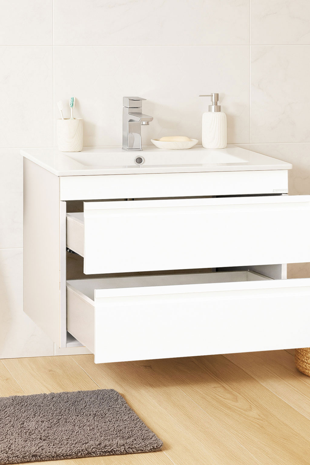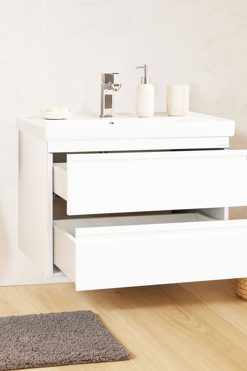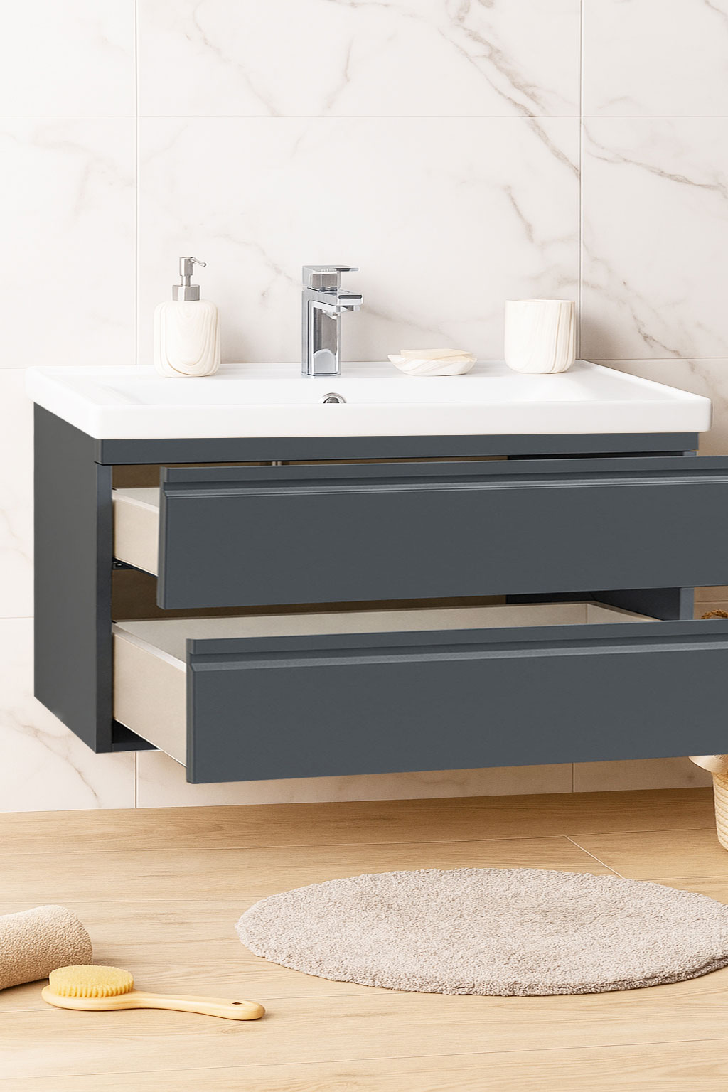 De la mobilier suspendat, la dulapuri spațioase sau oglinzi cu depozitare integrată, vei găsi opțiuni versatile care transformă baia într-un spațiu organizat și elegant.