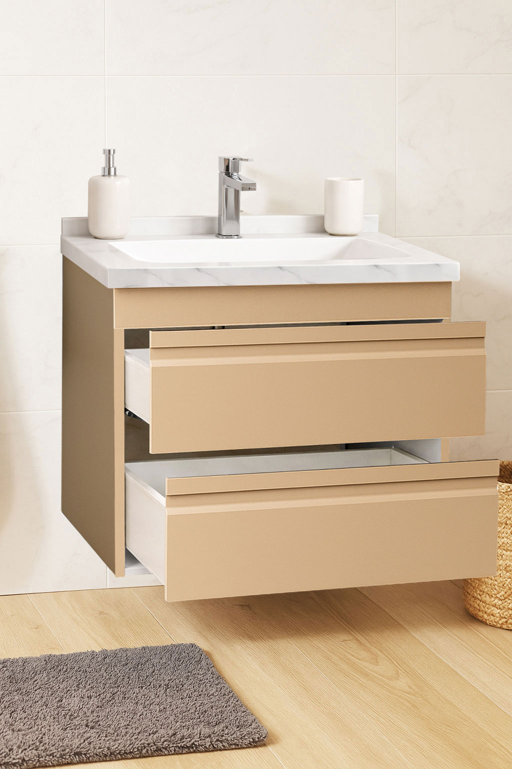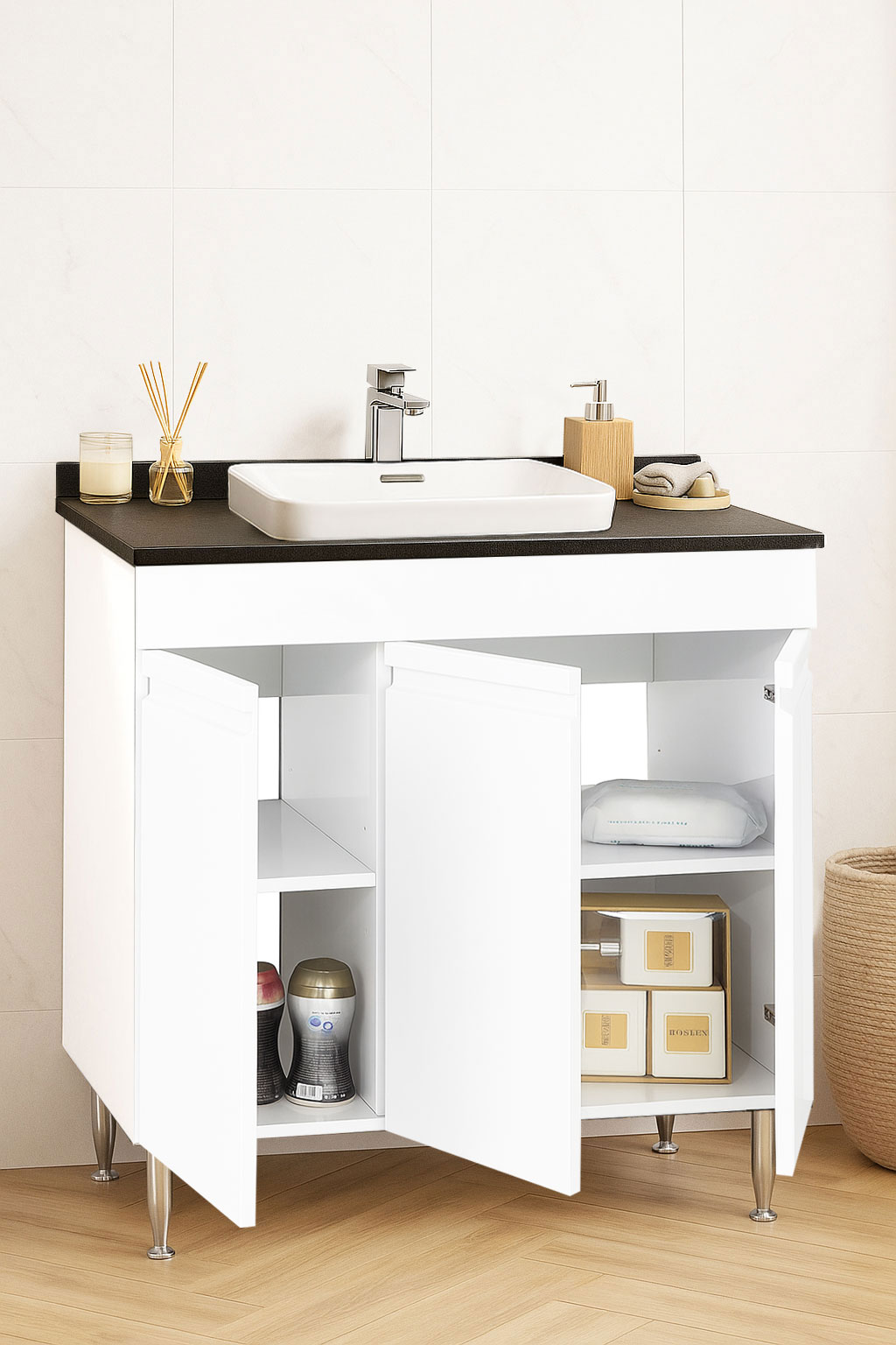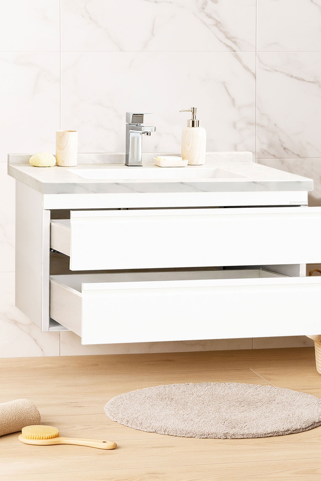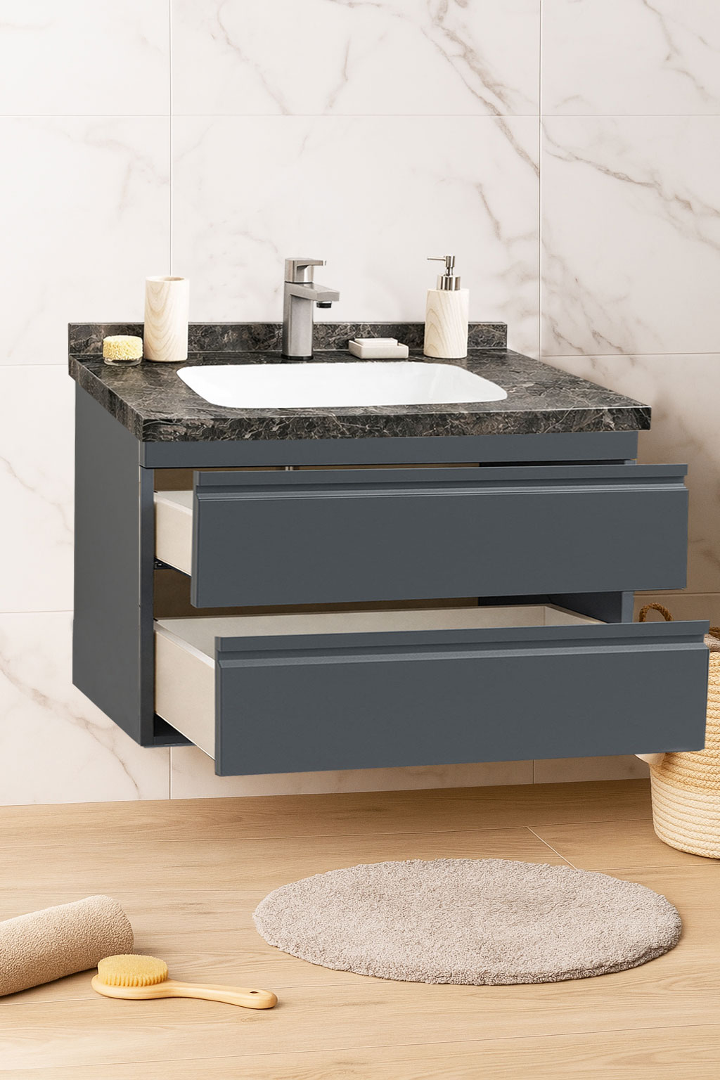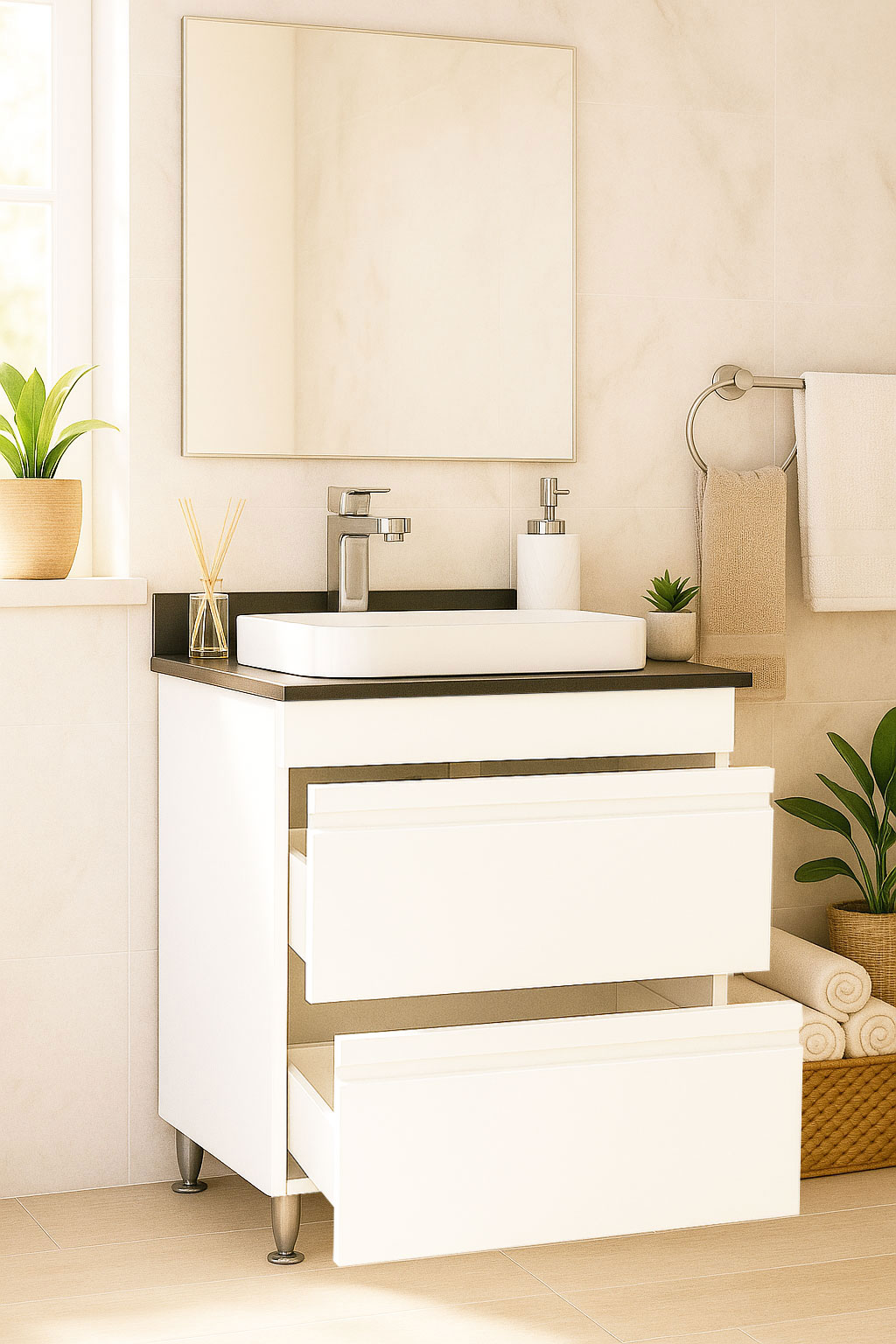 De la mobilier suspendat, la dulapuri spațioase sau oglinzi cu depozitare integrată, vei găsi opțiuni versatile care transformă baia într-un spațiu organizat și elegant.