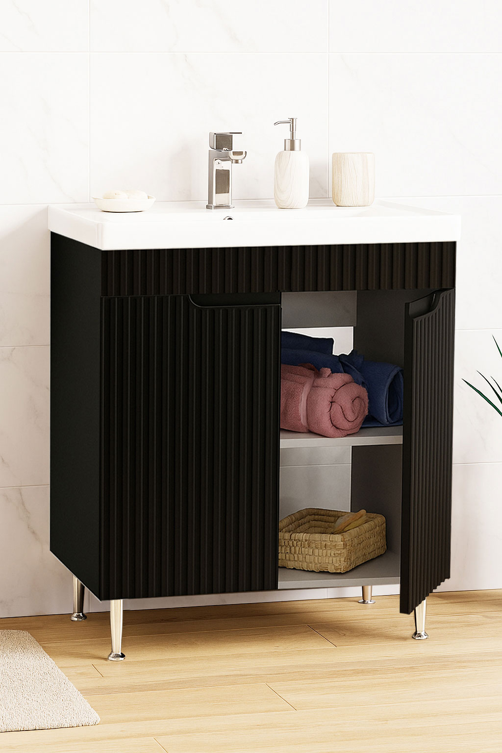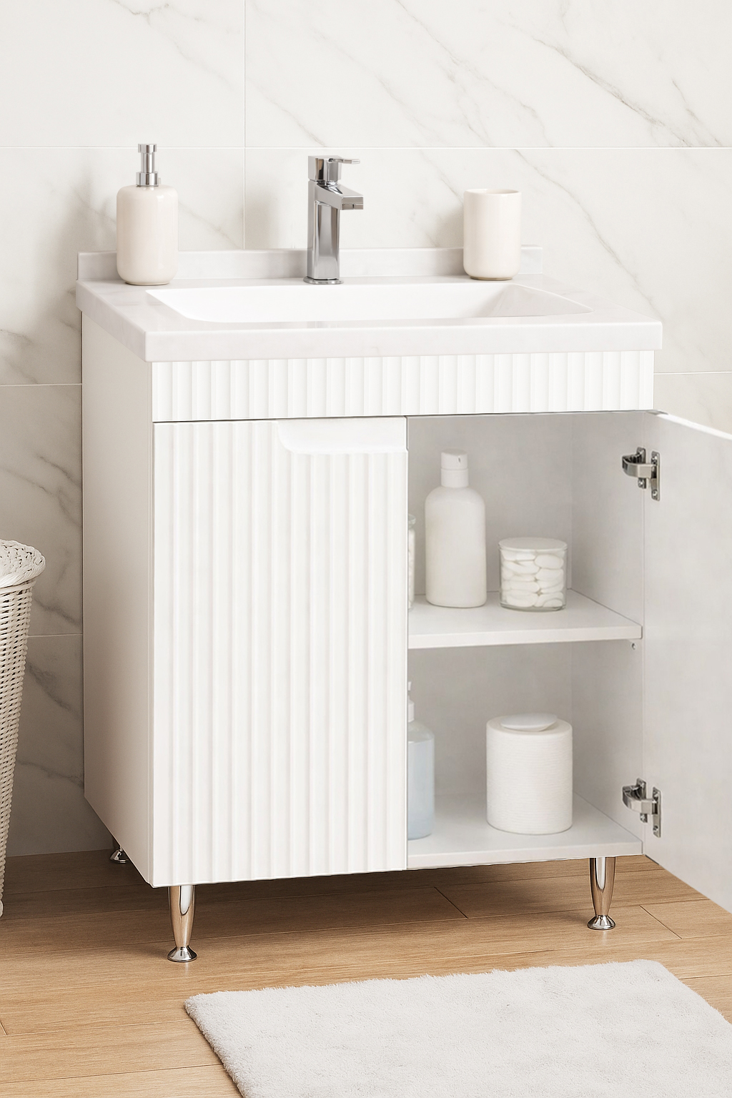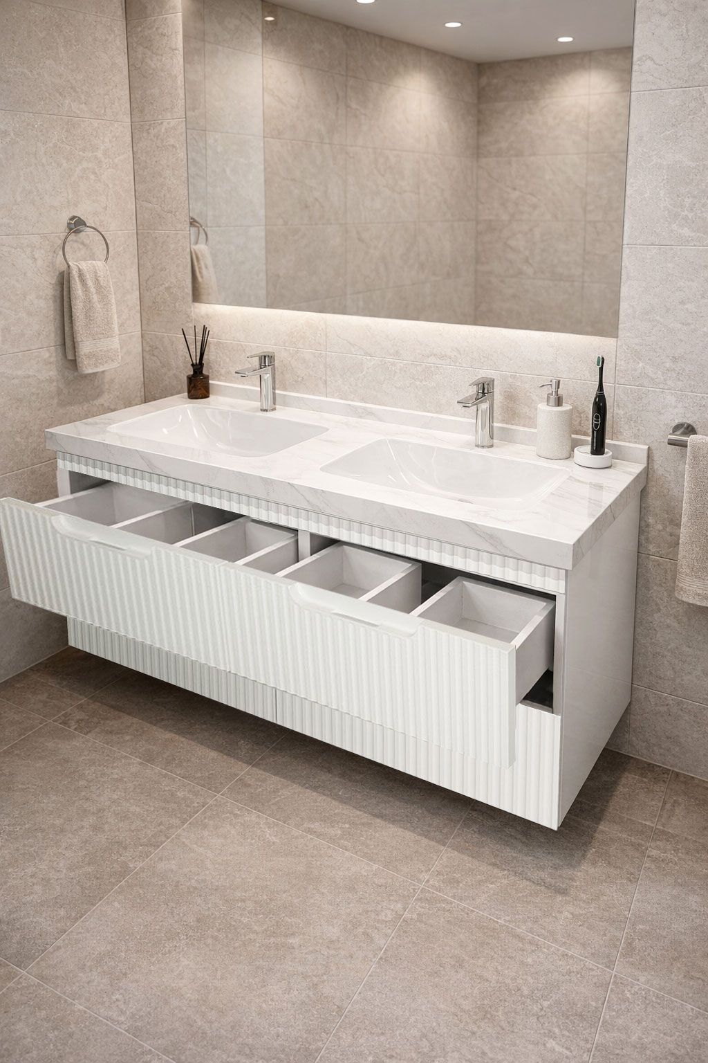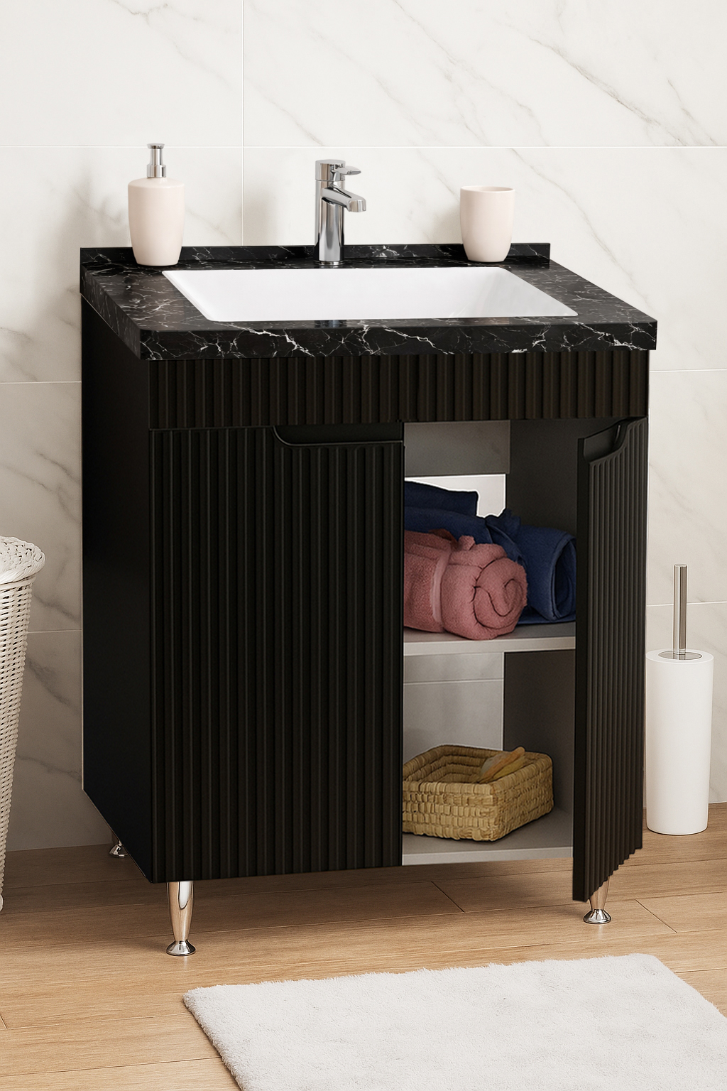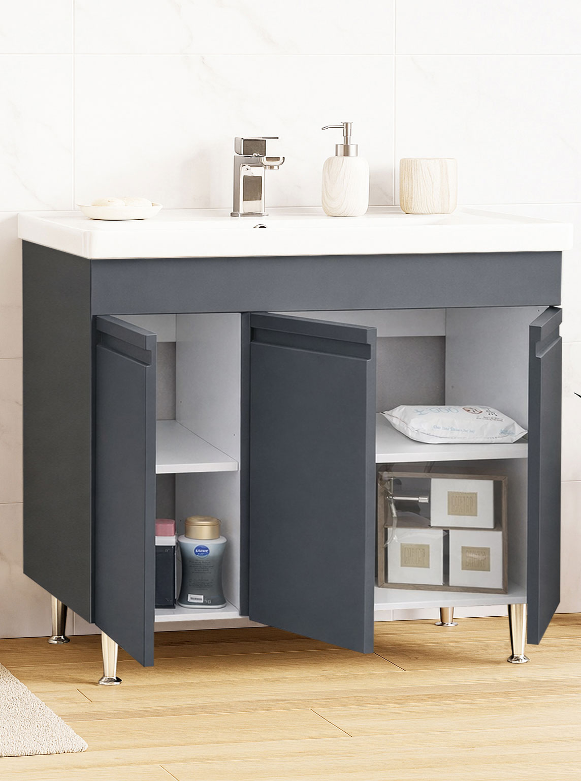 De la mobilier suspendat, la dulapuri spațioase sau oglinzi cu depozitare integrată, vei găsi opțiuni versatile care transformă baia într-un spațiu organizat și elegant.