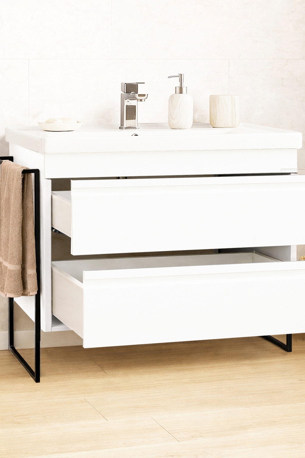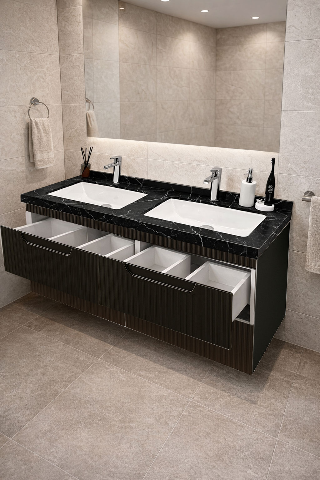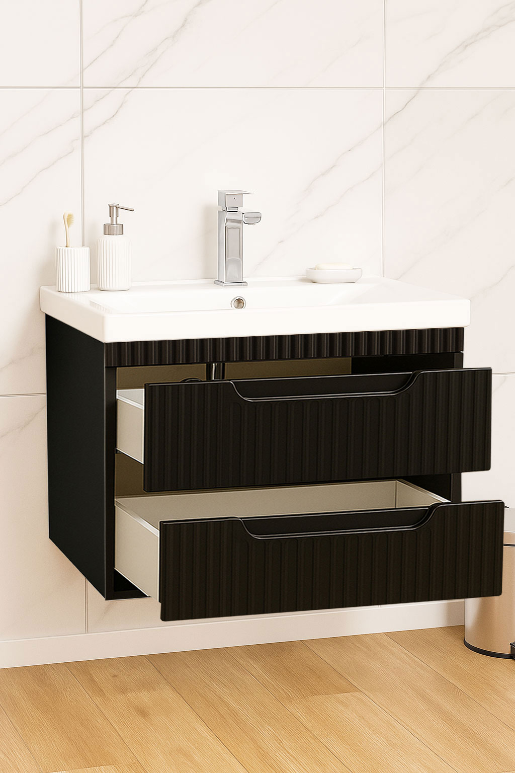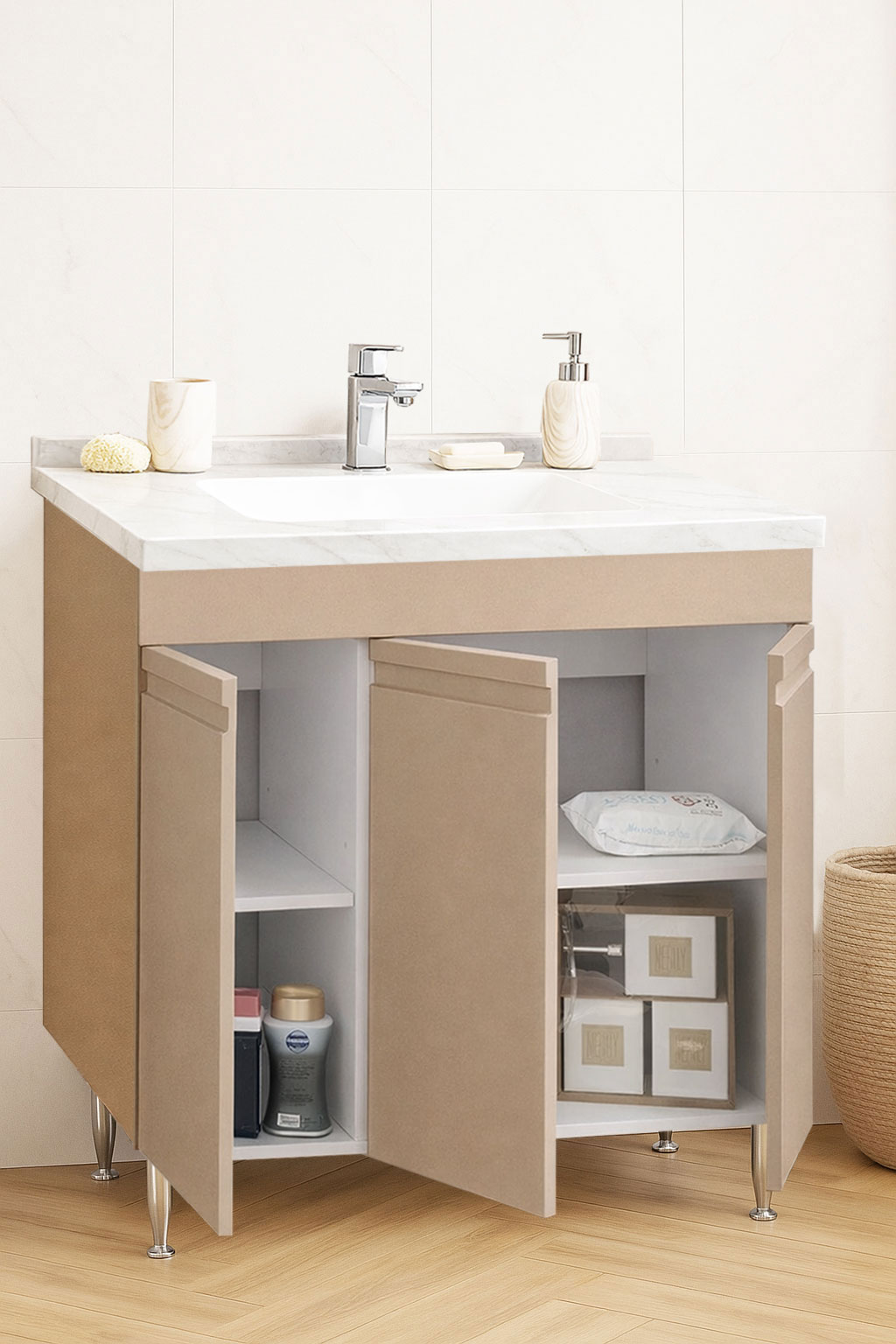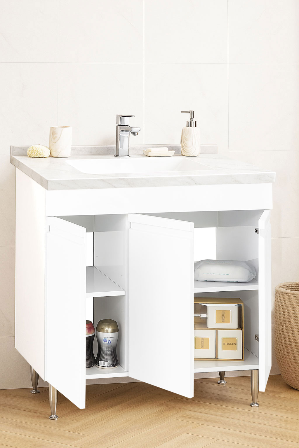 De la mobilier suspendat, la dulapuri spațioase sau oglinzi cu depozitare integrată, vei găsi opțiuni versatile care transformă baia într-un spațiu organizat și elegant.