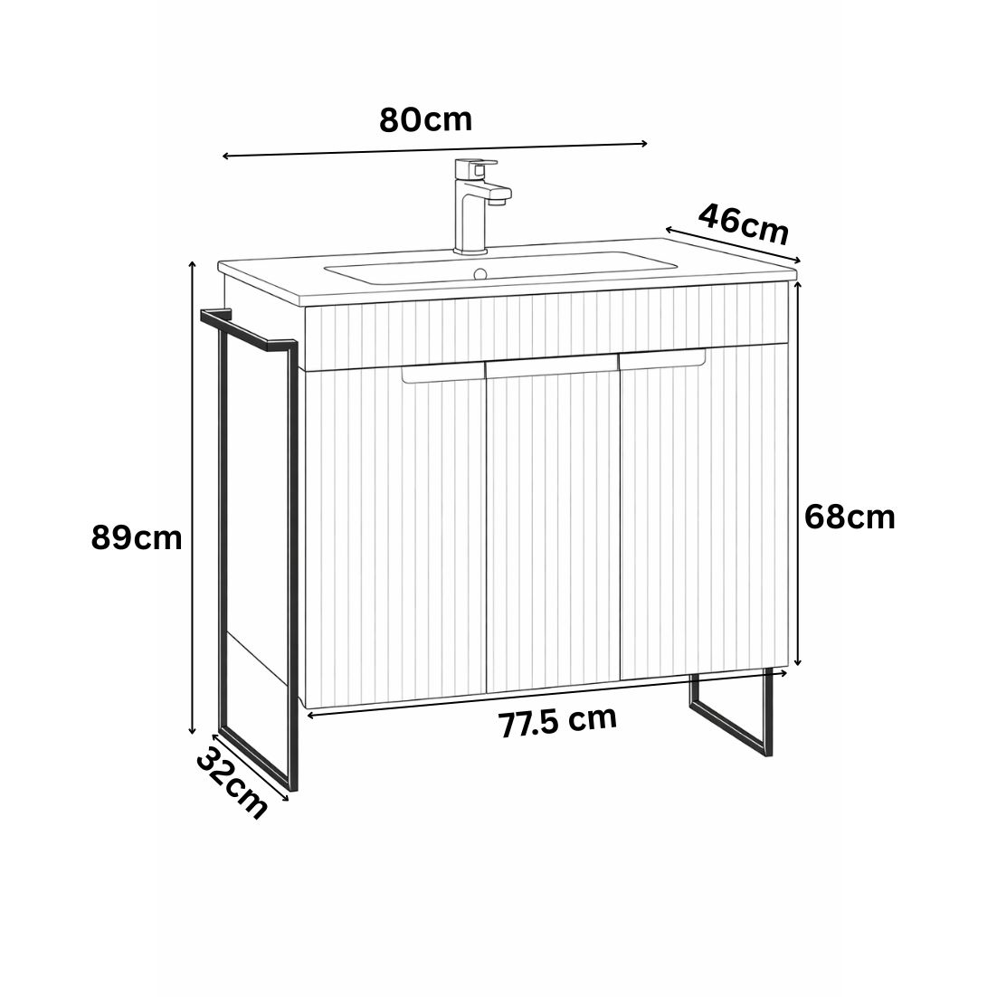 Dimensions Metal frame: Height 77.7 cm, Width 32.4 cm, Towel holder width 10 cm.