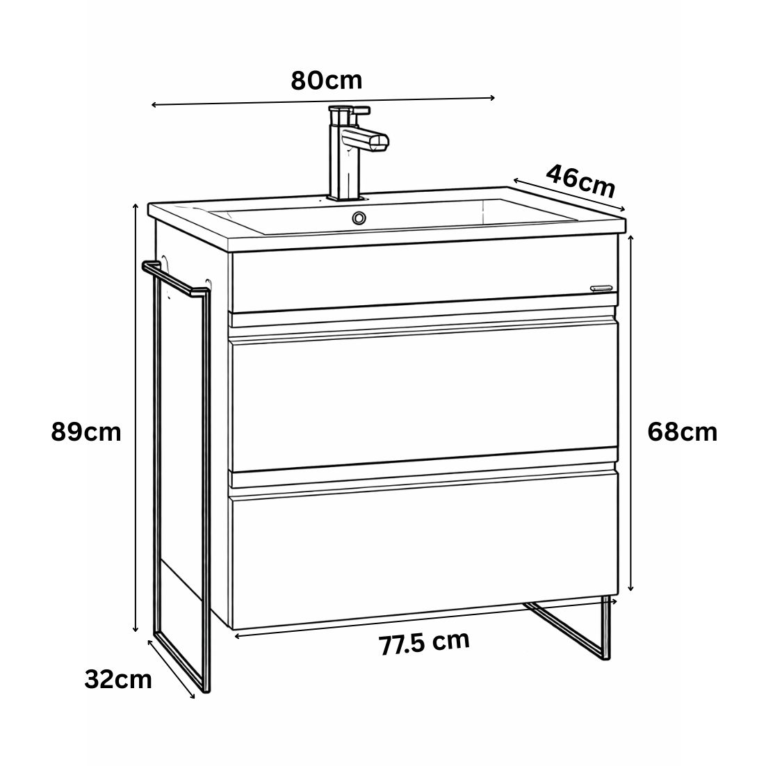 Structura mobilierului de baie este solidă și bine gândită: lateralele sunt realizate din PAL vopsit, iar fețele sertarelor sunt fabricate din MDF vopsit de calitate superioară, combinație care oferă rezistență sporită la utilizarea zilnică și un aspect premium. Grosimea lateralelor și a sertarelor de 16 mm asigură stabilitate și durabilitate în timp, fiind potrivită pentru un mobilier de baie utilizat frecvent.
