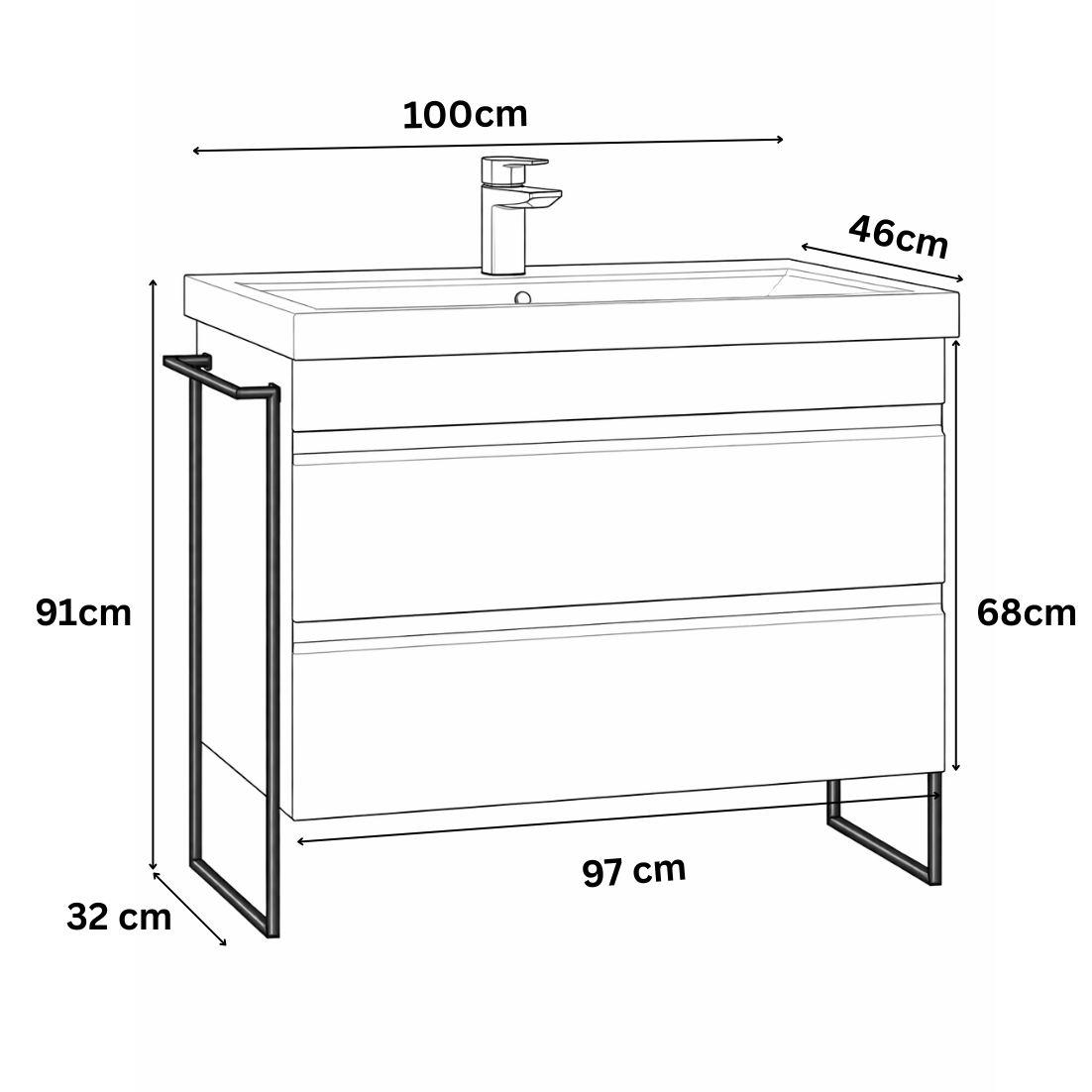 Structura mobilierului de baie este solidă și bine gândită: lateralele sunt realizate din PAL vopsit, iar fețele sertarelor sunt fabricate din MDF vopsit de calitate superioară, combinație care oferă rezistență sporită la utilizarea zilnică și un aspect premium. Grosimea lateralelor și a sertarelor de 16 mm asigură stabilitate și durabilitate în timp, fiind potrivită pentru un mobilier de baie utilizat frecvent.
