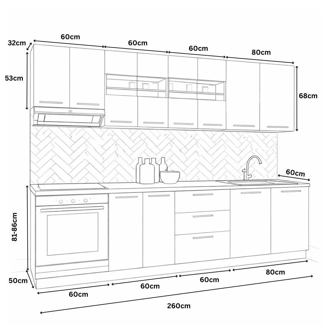 Dimensiuni: adancimea dulapurilor inferioare – 50 cm, iar a celor suspendate – 32 cm