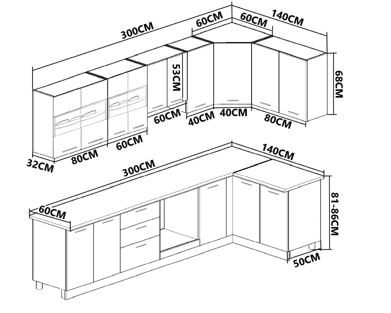 Dimensiuni: adancimea dulapurilor inferioare – 50 cm, iar a celor suspendate – 32 cm