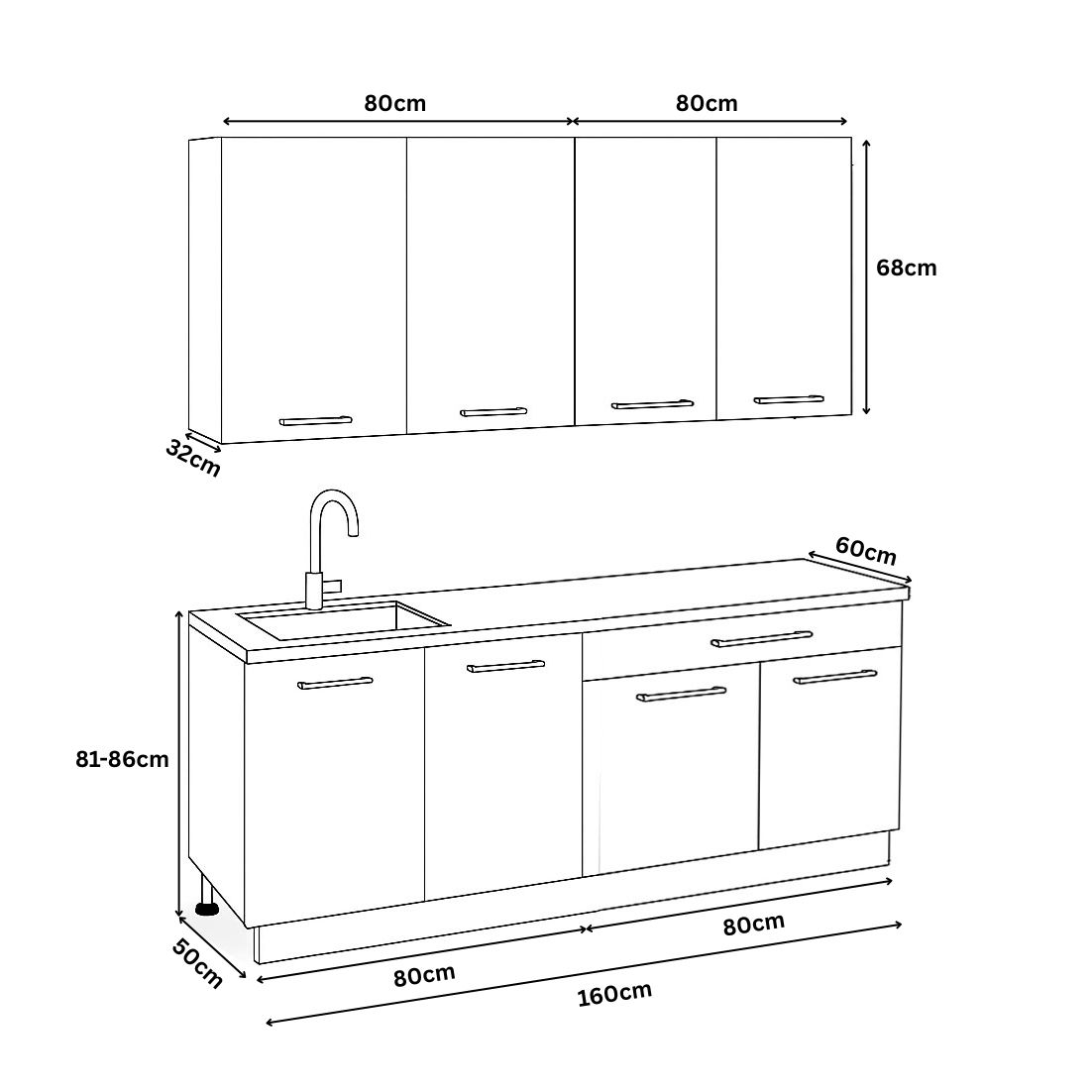 Dimensiuni: adancimea dulapurilor inferioare – 50 cm, iar a celor suspendate – 32 cm