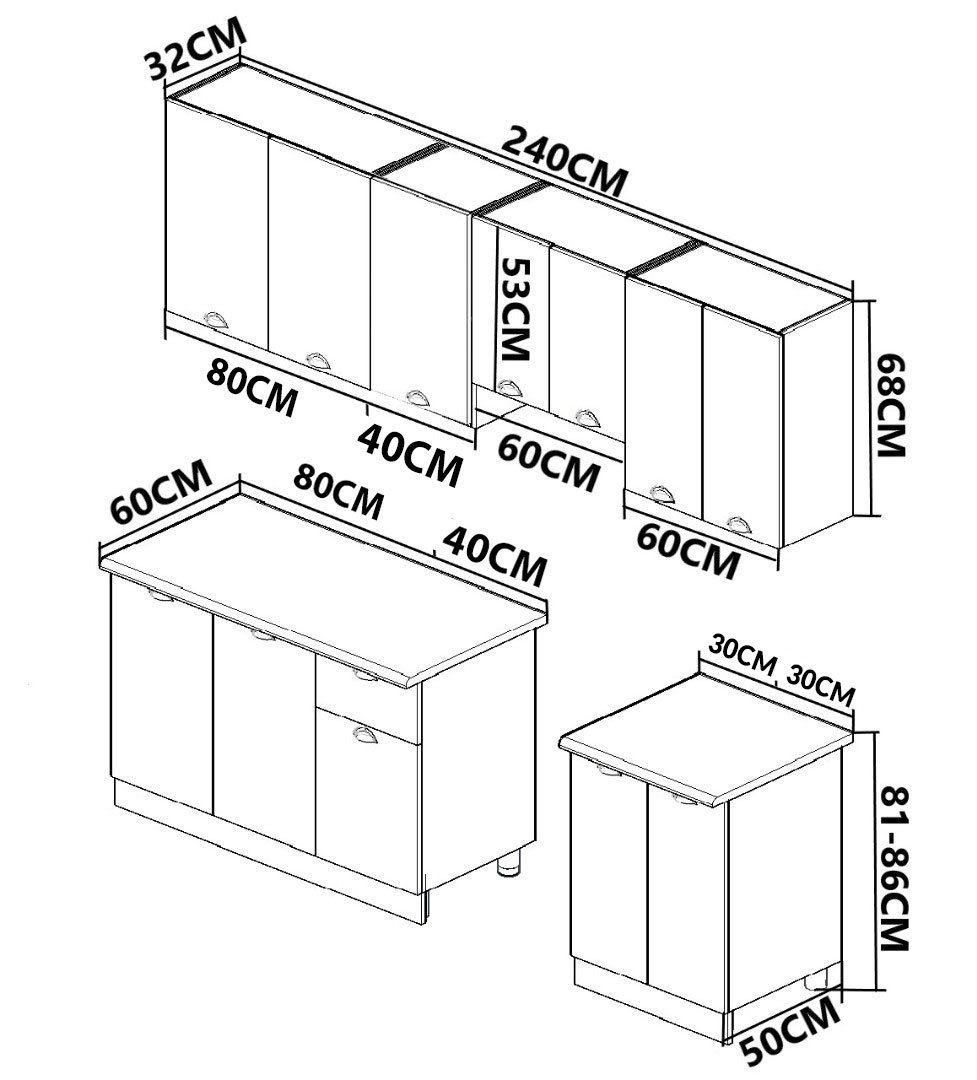 Dimensiuni: adancimea dulapurilor inferioare - 50 cm, iar a celor suspendate - 32 cm